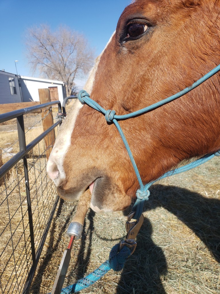 2. Let the horse have some revenge on your tools. I let Harley take out his frustration by biting on the handle of my file. He holds it in his mouth while I hold on to it, so it doesn’t stress out his teeth. It’s a pacifier basically.