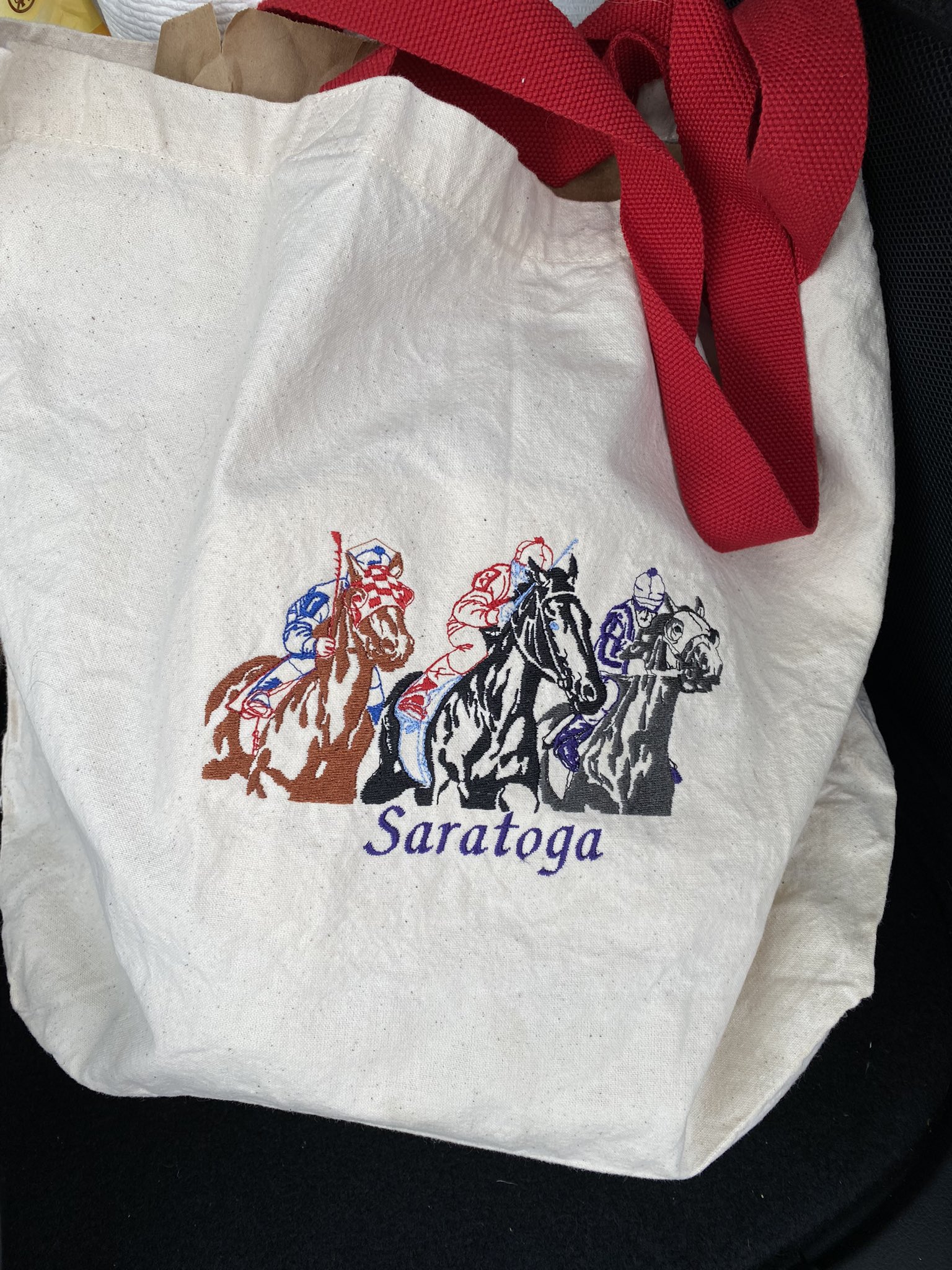 This design is 7X5 inches and I can make the horses whatever color you would like. I can also change the color of the jockey’s silks. If you wish me to add the name of a track, contact me, and I will let you know the cost.
