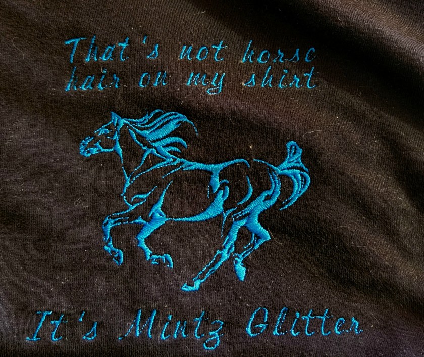 If you would like the Horse Glitter shirt personalized with your horse’s name, no problem. Contact me with the correct spelling, and it can easily be done.