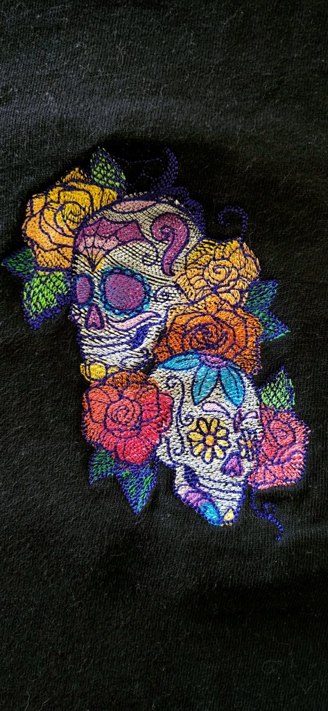 Another Day of the Dead set of skulls I just stitched out on a sweatshirt. This comes in two sizes 5X6 or 6X7. These Day of the Dead skulls are heavily stitched.