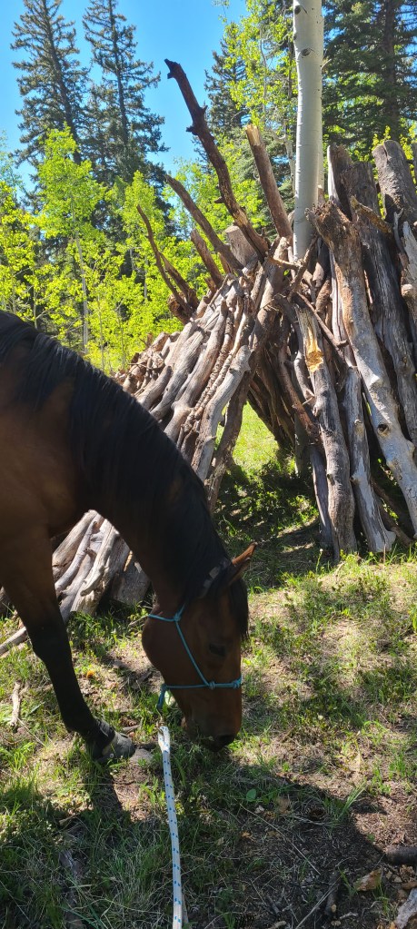 What I thought was a small path along a private fence turned out to be a big path deep into the forest. I never knew this existed, and it is the perfect path for a horse beginning to learn how to trail ride in the forest. The only challenge is that it’s at 9,200 feet, which is 3,200 feet higher than our home. I know this will challenge his lungs a bit. We take breaks as we walked along the path lined by Spruce’s and Aspens to give his lungs a chance to adjust. The air is heavy with the scent of forest. Each breath melts away my accumulated stress from the drive. I get a cellphone signal. I check my cameras, and Chaco and Harley are fine grazing away together.