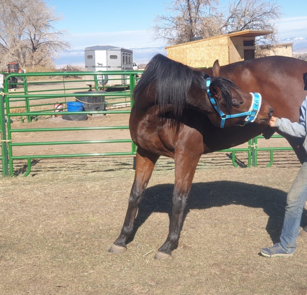 The other question I am asked is what will his second career be? Well, the first six months was about letting him learn how to be a horse again. Winter hit and we were buried in snow or drowned in rain. Mud…. we had the longest mud season ever as several atmospheric rivers flowed above us. Trying to work with any of the horses was next to impossible. When the ground did dry out a couple of times, I let him be with the horses instead of asking him to do anything else. I think the prolonged rest, in the long run, this did his body and mind good.