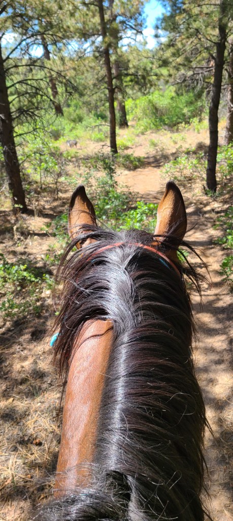 We weren’t riding alone though. My dogs were with us, and I brought Harley, my 20 yo quarter horse, along. Harley has been on every trail around this area. I thought he would keep Dulce calm on this brand new trail and be a good teacher. Harley was more interested in high elevation grass. Every time I paid more attention to helping Dulce through another obstacle, he tried to drag me off the saddle as he dove for a big bite. If Dulce and I went to the left, he’d turn right. Harley’s mind was on green grass and that was it. Being in a drought, who can blame him? My right arm sure could as I tried to stop him from snatching. He jerked me around in every direction. I tried to keep my frustration with Harley at a minimum, because I didn’t want my emotions to agitate Dulce.